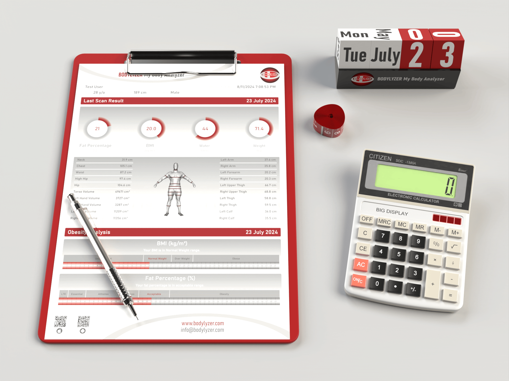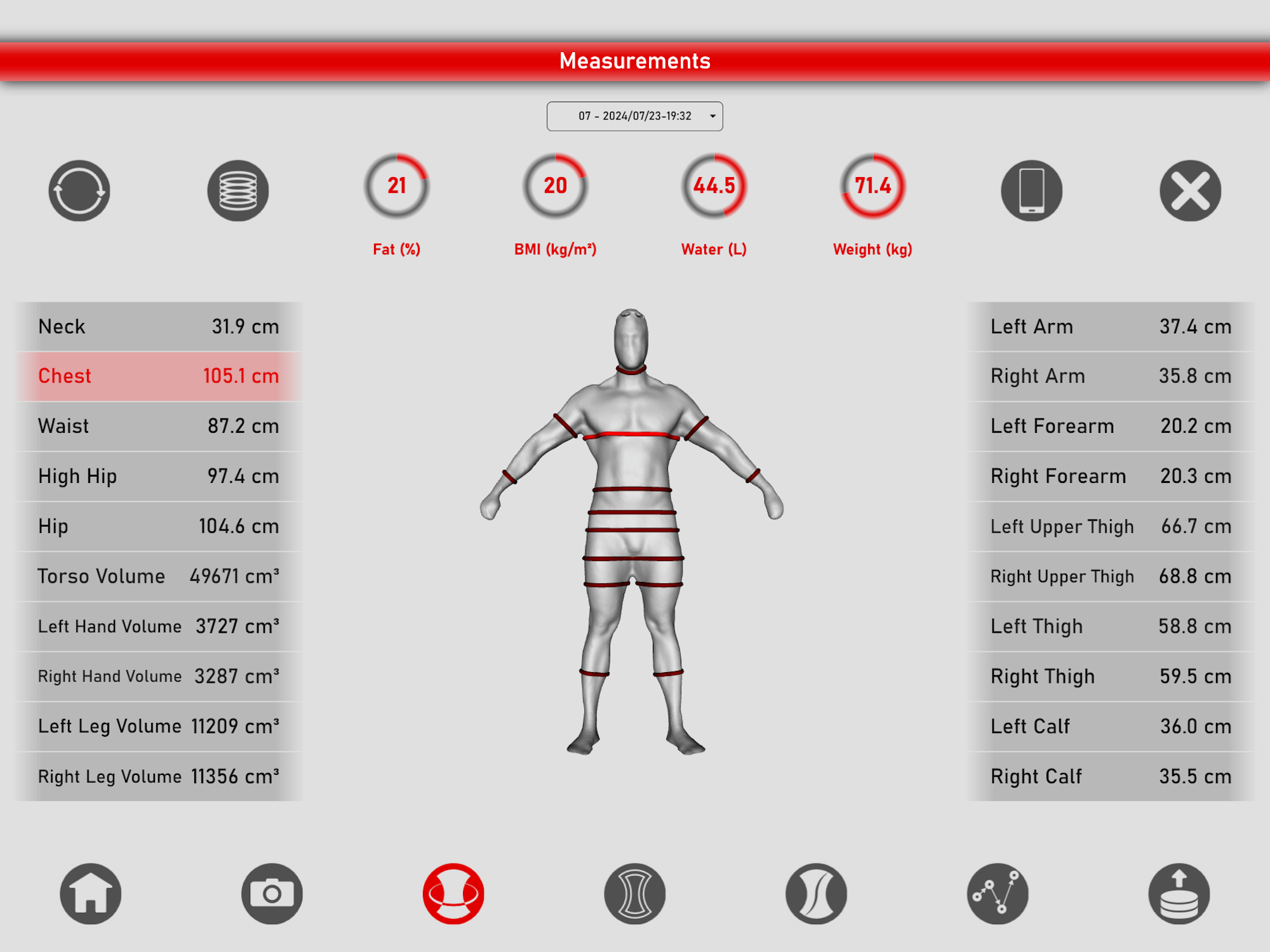 BODYLYZER is an advanced 3D body scanning and analyzing system designed to capture a comprehensive model of your entire body in under a minute using safe infrared technology. BODYLYZER measures your body dimensions and provides detailed health metrics, such as body fat percentage and water volume.
